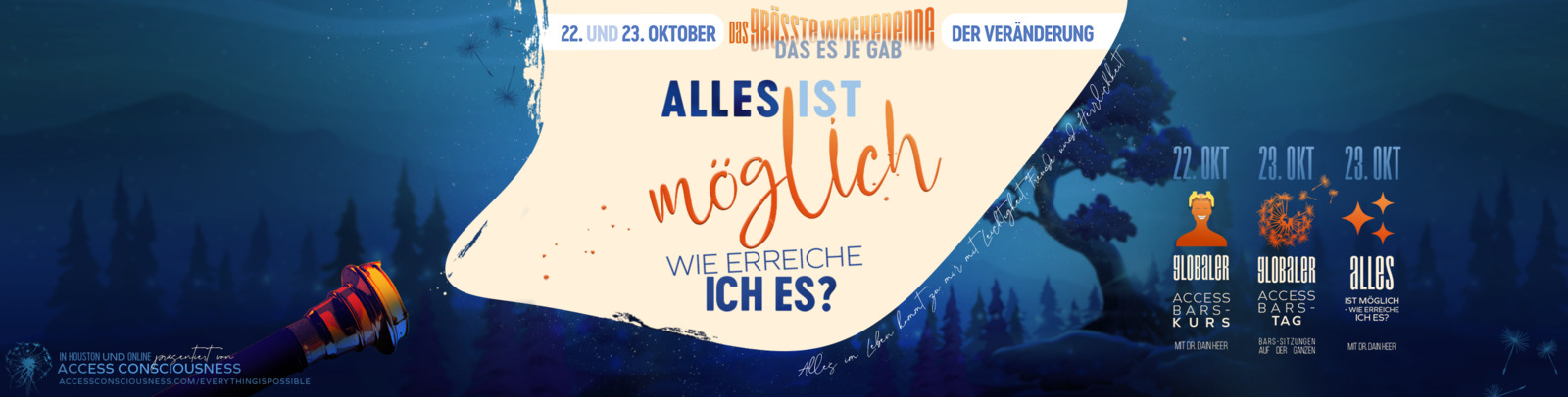 Willkommen zum größten Wochenende der Veränderung, das es jemals gab. Eine besondere Veranstaltungsreihe, die dich dazu einlädt, zu entdecken, was für dich noch möglich ist – und wie du mit Leichtigkeit, Freude und Herrlichkeit dahin kommst!